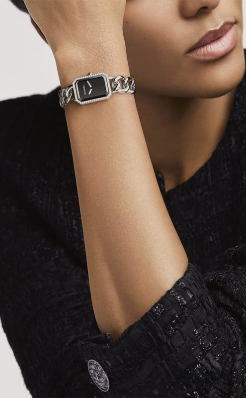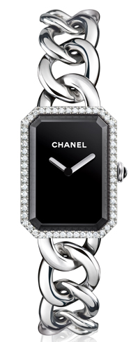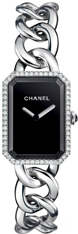 Часы Chanel Les Intemporelles de Chanel Premiere выпущены в корпусе из нержавеющей стали размером 20 х 28 х 6.6 мм с водонепроницаемостью 30 м. Внутри корпуса установлен кварцевый механизм. На черном циферблате отображаются часы, минуты. Часы комплектуются браслетом из нержавеющей стали. Безель из белых бриллиантов.