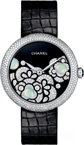 Модель Mademoiselle Privé Camélia поставляется в корпусе диаметром 37. 5 мм из белого золота, инкрустированного бриллиантами круглой огранки. Циферблат черного цвета украшен белыми бриллиантами и 3-мя опалами. Mademoiselle Privé Camélia отображают часы и минуты благодаря своему часовому механизму с автозаводом, при запасе хода в 42 часа. Часы оснащены черным ремешком из кожи аллигатора с застежкой из белого золота 18к. Серия ограничена 18 шт.
