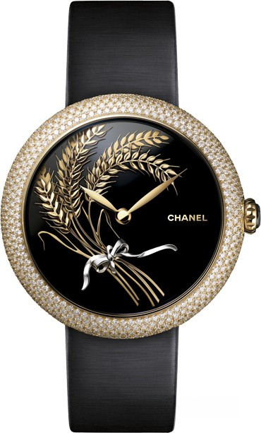 Часы Mademoiselle Privé H4900. Корпус из желтого золота 18 карат с 552 бриллиантами классической огранки (≈3,03 карата). Циферблат из оникса с изображением колосьев пшеницы из желтого золота 18 карат и банта из белого золота 18 карат. Заводная коронка с кабошоном из оникса. Черный атласный ремешок, раскладывающаяся застежка из белого золота 18 карат с 80 бриллиантами классической огранки (≈ 0,49 карата). Механизм с автоматическим подзаводом. Запас хода 42 часа. Водонепроницаемость 30 м. Диаметр 37.5 мм.