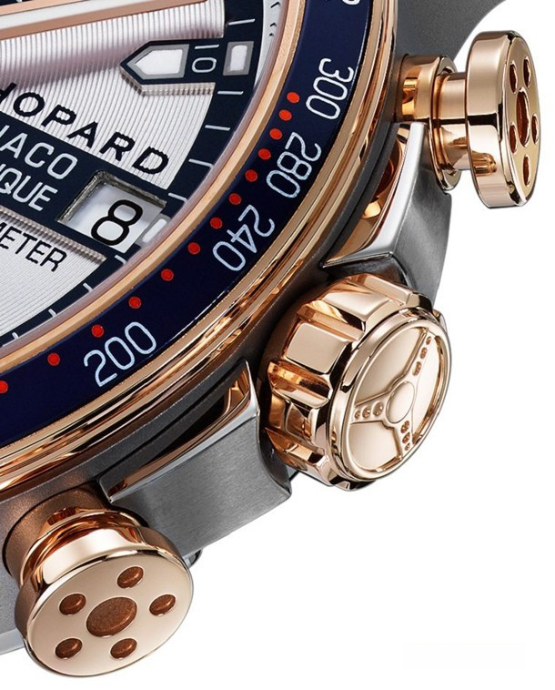 Часы Chopard Grand Prix De Monaco Historique 2018 Race Edition выпущены в корпусе из нержавеющей стали, титана и розового золота 18к размером 44.5 х 14.1 мм и водонепроницаемостью 100 м. Внутри корпуса установлен автоматический механизм, Калибр 7750. На серебристом гильошированном с синим циферблате отображаются часы, минуты, секунды, дата, тахиметр. Запас хода 46 часов. Часы комплектуются кожаным ремешком с вставкой из нержавеющей стали. Серия ограничена - 100 шт.