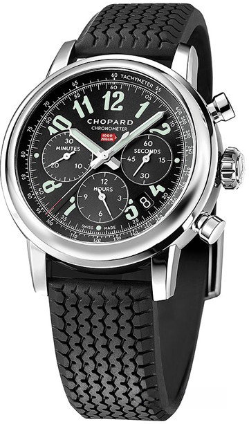 Официальный хронометрист гонки Mille Miglia, компания Chopard представляет мужскую модель Mille Miglia Chronograph с автоматическим заводом в корпусе из нержавеющей стали, выпущенную в честь этого самого известного в мире ретро-ралли. Ее элегантные формы перекликаются с эстетикой классического автомобиля, черный циферблат ассоциируется с винтажным стилем его корпуса, а «двигатель», имеющий сертификат хронометра, подчеркивает сходство между автомобильной и часовой механикой. Благодаря знаменитому ремешку из каучука с рисунком протектора шин Dunlop 1960-х годов, эти выразительные часы прекрасно адаптируются к запястью.