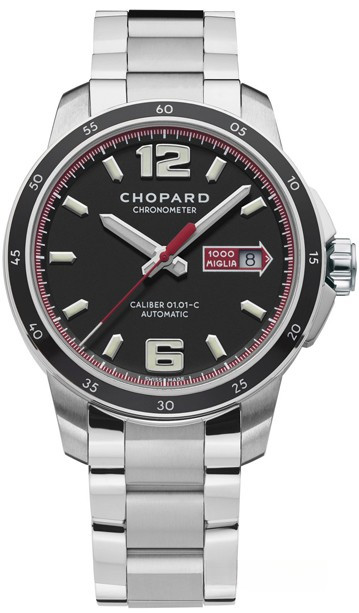 Круглый корпус новинки, изготовленный из нержавеющей стали, диаметром 43 мм, водонепроницаемый до 100 метров. Защищенная завинчивающаяся рифленая заводная головка расположена на 3 часах. Фиксированный безель с черным покрытием, размеченный арабскими цифрами, отделенный от циферблата круглой контрастной красной вставкой. Сапфировое стекло установлено на передней стороне часового корпуса (с антибликовым покрытием) и на его завинчивающейся задней крышке. Матово-черный циферблат с накладными арабскими цифрами и часовыми индексами, покрытыми, как и часовая и минутная стрелки, люминесцентным составом SuperLuminova белого цвета. Секундная стрелка красного цвета. Модель оснащена мануфактурным швейцарским автоматическим механизмом Chopard 01.01-C, с 60-часовым запасом хода, функциями индикации часов, минут, секунд (посредством соответствующих центральных стрелок) и даты (посредством соответствующего цифрового указателя в прямоугольной апертуре, расположенной на 3 часах). Калибр официально сертифицирован COSC (Contrôle Officiel Suisse des Chronomètres) в качестве хронометра. Поставляется на браслете из нержавеющей стали.