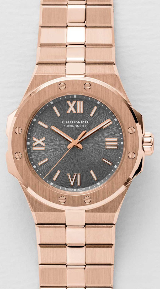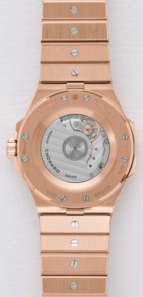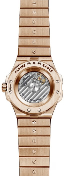 Актуальные, изысканные и выразительные, новые модели Alpine Eagle в стиле спортивный шик являются современной версией первых наручных часов St Moritz, созданных в 1980 году Карл-Фридрихом Шойфеле, сопрезидентом Дома Chopard в настоящее время. Он лично придумал и разработал дизайн часов Alpine Eagle, движимый безграничной любовью к Альпам и вдохновленный величественным образом безраздельно властвующего в альпийском небе орла. Часы из розового золота 18к оснащены механизмом, прошедшим сертификацию хронометра. Alpine Eagle – это посвящение современным орлам, целеустремленным людям, которые каждый день превосходят самих себя и вдохновляют своим мировоззрением. Наделенные неординарной проницательностью и решимостью, они работают над вызовами завтрашнего дня, глубоко осознавая необходимость борьбы за сохранение нашей планеты. Полностью разработанный и изготовленный в часовых мастерских Chopard, механический калибр с автоматическим заводом Chopard 09.01-C прошел сертификацию хронометра COSC и работает с частотой 25 200 полуколебаний в час. Благодаря 42-часовому запасу хода он обеспечивает показания часов, минут и секунд в характерной для Chopard элегантной манере.