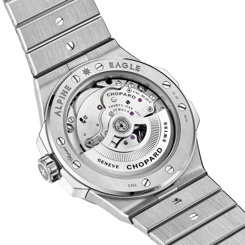 Актуальные, изысканные и выразительные, новые модели Alpine Eagle в стиле спортивный шик являются современной версией первых наручных часов St Moritz, созданных в 1980 году Карл-Фридрихом Шойфеле, сопрезидентом Дома Chopard в настоящее время. Он лично придумал и разработал дизайн часов Alpine Eagle, движимый безграничной любовью к Альпам и вдохновленный величественным образом безраздельно властвующего в альпийском небе орла. Часы из белого золота 18к оснащены механизмом, прошедшим сертификацию хронометра. Alpine Eagle – это посвящение современным орлам, целеустремленным мужчинам, которые каждый день превосходят самих себя и вдохновляют своим мировоззрением. Наделенные неординарной проницательностью и решимостью, они работают над вызовами завтрашнего дня, глубоко осознавая необходимость борьбы за сохранение нашей планеты. Полностью разработанный и изготовленный в часовых мастерских Chopard, механический калибр с автоматическим заводом Chopard 01.15-C прошел сертификацию хронометра COSC и работает с частотой 28 800 полуколебаний в час. Благодаря 60-часовому запасу хода и функции остановки секундной стрелки он с безупречной точностью обеспечивает показания часов, минут, секунд и даты в характерной для Chopard элегантной манере.