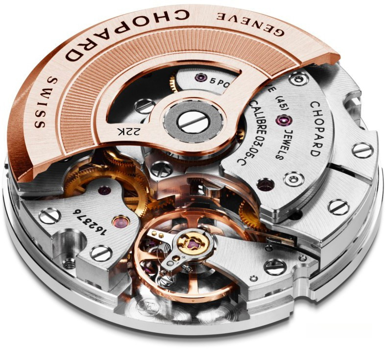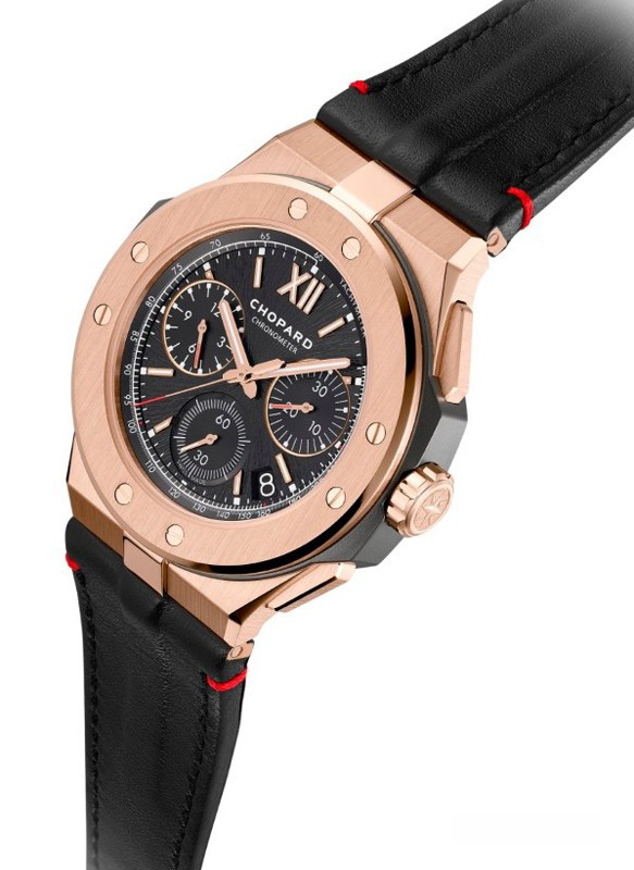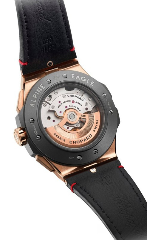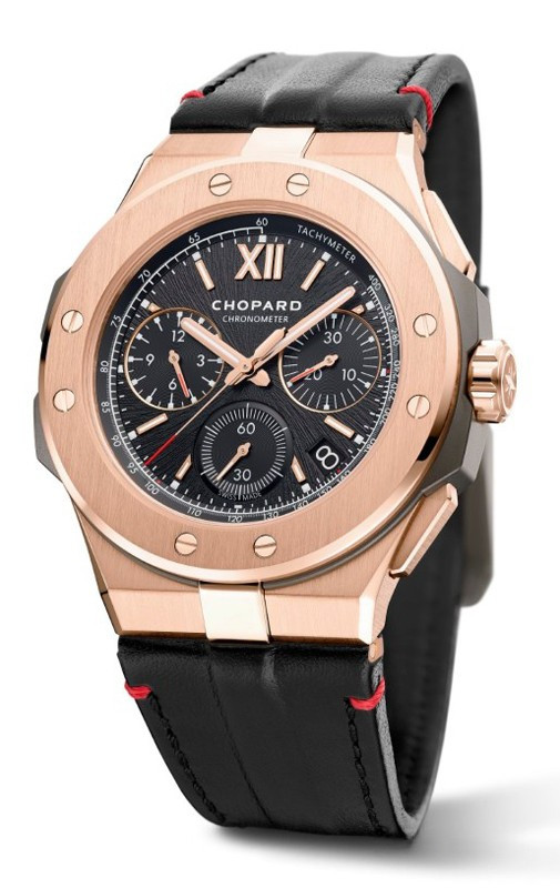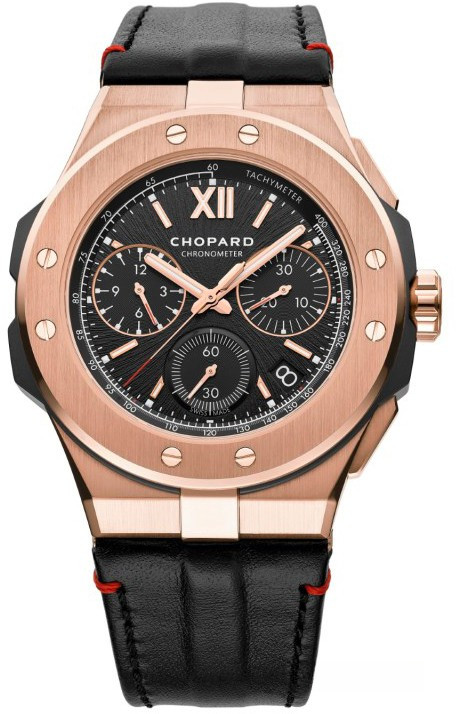 Часы Chopard Alpine Eagle XL Chrono представлены в корпусе из розового золота 18к размером 44 х 13.15 мм, водонепроницаемостью 100 метров. Внутри корпуса установлен автоматический механизм, Калибр Chopard 03.05-C, обладающий запасом хода 60 часов. На черном циферблате отображаются часы, минуты, секунды, дата, накопители хронографа, тахиметр. Часы комплектуются кожаным ремешком с золотой застежкой.