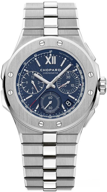 Часы Chopard Alpine Eagle XL Chrono представлены в корпусе из нержавеющей стали размером 44 мм, водонепроницаемостью 100 метров. Внутри корпуса установлен автоматический механизм, Калибр Chopard 03.05-C, обладающий запасом хода 60 часов. На синем циферблате отображаются часы, минуты, секунды, дата, накопители хронографа, тахиметр. Часы комплектуются браслетом из нержавеющей стали.