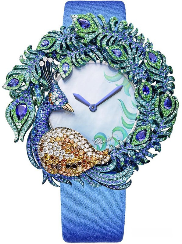 Часы Chopard Animal World Peacock представлены в корпусе размером 26 х 15 мм из белого золота 18к и титана водонепроницаемостью 30 метров. Внутри корпуса установлен автоматический механизм. На голубом жемчужном циферблате отображаются часы, минуты. Часы поставляются на сатиновом ремешке с золотой застежкой. Корпус инкрустирован турмалинами, бриллиантами, цаворитами.