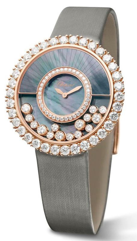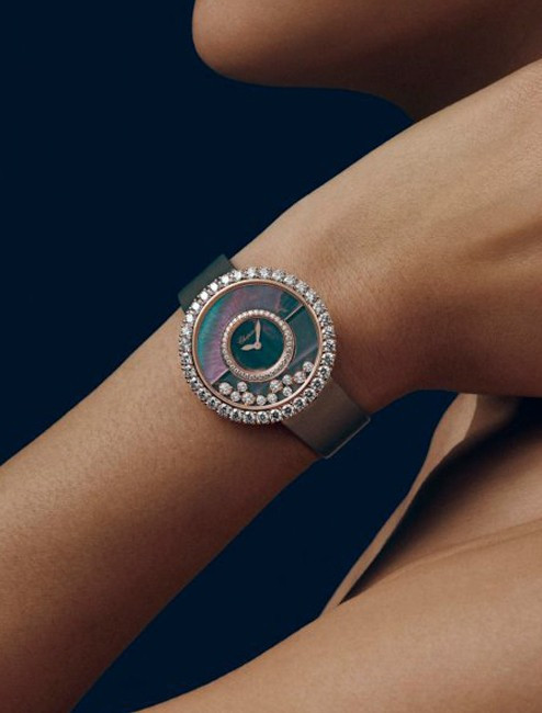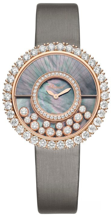 Часы Happy Diamonds Joaillerie выполнены из 18-каратного розового золота и украшены белыми бриллиантами. Корпус обрамляет изысканный черный жемчужный циферблат с двумя стрелками из розового золота, приводимыми в движение кварцевым механизмом. 15 плавающих белых бриллиантов свободно перемещаются между двумя сапфировыми стеклами. Часы поставляются с сатиновым ремешком.