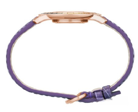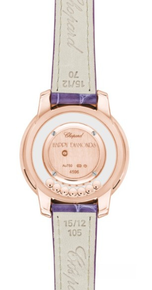 Часы Happy Diamonds Joaillerie выполнены из 18-каратного розового золота и украшены разноцветными багетными сапфирами. Корпус обрамляет изысканный белый жемчужный циферблат с двумя стрелками из розового золота, приводимыми в движение кварцевым механизмом. Пять плавающих драгоценнх камней свободно перемещаются между двумя сапфировыми стеклами. Часы поставляются с фиолетовым ремешком из кожи аллигатора.