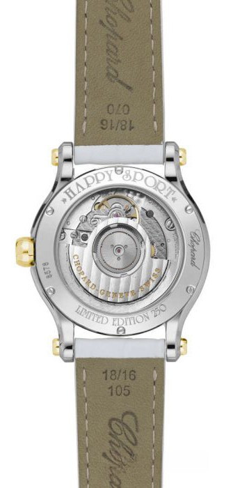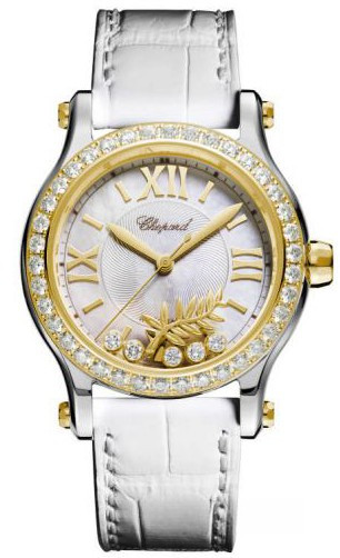 Часы Chopard Happy Diamonds Happy Palm представлены в корпусе размером 36 мм из желтого золота 18к и нержавеющей стали водонепроницаемостью 30 метров. Внутри корпуса установлен автоматический механизм, обладающий запасом хода 42 часа. На белом жемчужном циферблате с 5-ю белыми плавающими бриллиантами и авльмовой ветвю отображаются часы, минуты и секунды. Часы поставляются на ремешке из кожи аллигатора с вставкой из нержавеющей стали. Безель из белых бриллиантов. Часы выпущены ограниченной серией 250 штук.