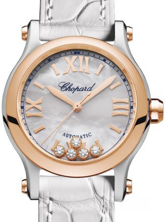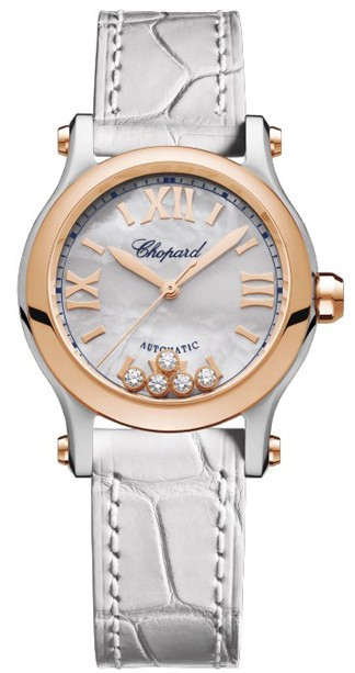 Часы Happy Sport с автоматическим подзаводом буквально искрятся элегантной женственностью. Корпус из нержавеющей стали и розового золота 18к диаметром 30 мм отличается совершенством плавных линий и яркой оригинальностью. Перламутровый циферблат подчеркивает роскошные римские цифры и изысканные детали отделки, а пять фирменных подвижных бриллиантов исполняют проникнутый светом и радостью игривый танец. Часы комплектуются автоматическим механизмом, Калибр 09.01-C, обладающим запасом хода 42 часа. Модель комплектуется ремешком из кожи аллигатора.
