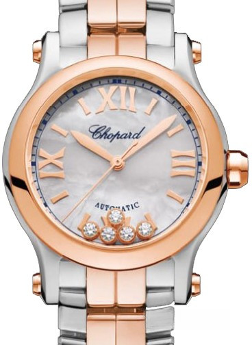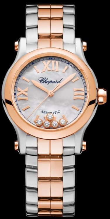 Часы Happy Sport с автоматическим подзаводом буквально искрятся элегантной женственностью. Корпус из нержавеющей стали и розового золота 18к диаметром 30 мм отличается совершенством плавных линий и яркой оригинальностью. Перламутровый циферблат подчеркивает роскошные римские цифры и изысканные детали отделки, а пять фирменных подвижных бриллиантов исполняют проникнутый светом и радостью игривый танец. Часы комплектуются автоматическим механизмом, Калибр 09.01-C, обладающим запасом хода 42 часа. Модель комплектуется браслетом из нержавеющей стали и розового золота 18к.