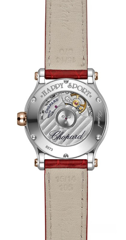 Часы Happy Sport с автоматическим подзаводом буквально искрятся элегантной женственностью. Корпус из нержавеющей стали и розового золота 18к диаметром 30 мм отличается совершенством плавных линий и яркой оригинальностью. Серебристый гильошированный циферблат подчеркивает роскошные римские цифры и изысканные детали отделки, а пять фирменных подвижных драгоценных камней исполняют проникнутый светом и радостью игривый танец. Часы комплектуются автоматическим механизмом, Калибр 09.01-C, обладающим запасом хода 42 часа. Модель комплектуется ремешком из кожи аллигатора с вставкой из нержавеющей стали.