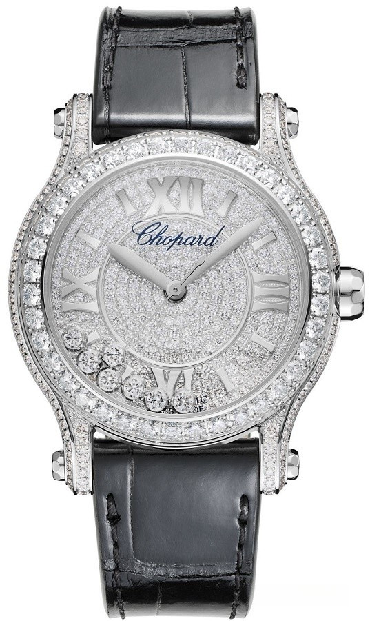 Стильные женственные часы Happy Sport из белого золота 18к оснащены механическим калибром с автоподзаводом. Гладкий спортивный корпус, инкрустированный белыми бриллиантами, на идеально подходящем к нему ремешке из кожи аллигатора и современный циферблат, усыпанный бриллиантами, выражают представление Chopard о непринужденном стиле. Знаковые для бренда подвижные бриллианты исполняют проникнутый светом и радостью игривый танец.