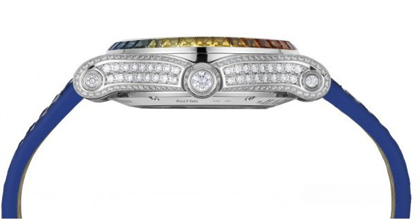 водонепроницаемость 30 м, корпус инкрустирован белыми бриллиантами, безель из багетных оранжевых, желтых, синих, фиолетовых сапфиров