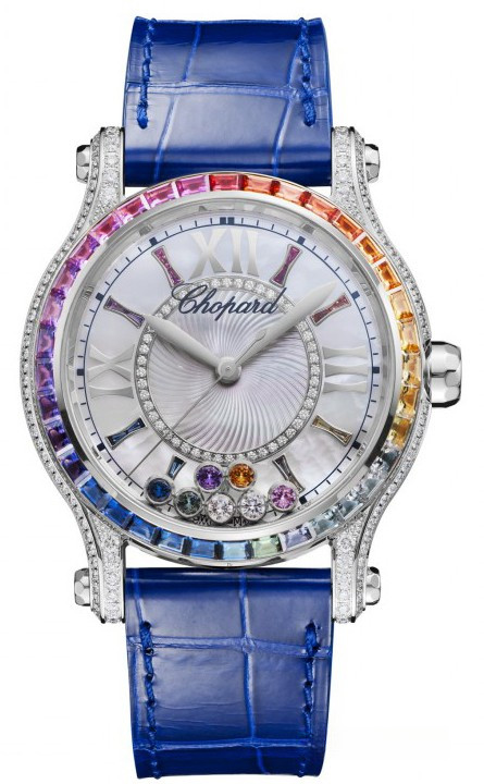 Часы Happy Sport Medium Automatic - это хорошо известная женская модель. Белое золото 18к отображает легендарный дизайн Chopard. Внутри корпуса находится автоматический механизм с запасом хода 42 часа и функциями часов, минут, секунд. Под сапфировым стеклом на циферблате свободно перемещаются 7 драгоценных камней, включая 2 бриллианта, 3 сапфира и 2 изумруда. На белом жемчужном гильошированном циферблате расположены накладные золотые римские цифры 3, 6, 9 и 12, а между ними - накладные часовые маркеры с вставками из сапфиров и изумрудов. Водонепроницаемость корпуса до 30 метров. Часы поставляются на ремешке из кожи аллигатора с вставкой из белого золота 18к.