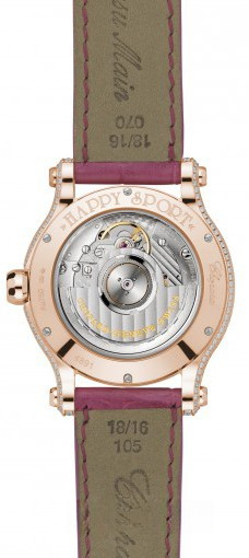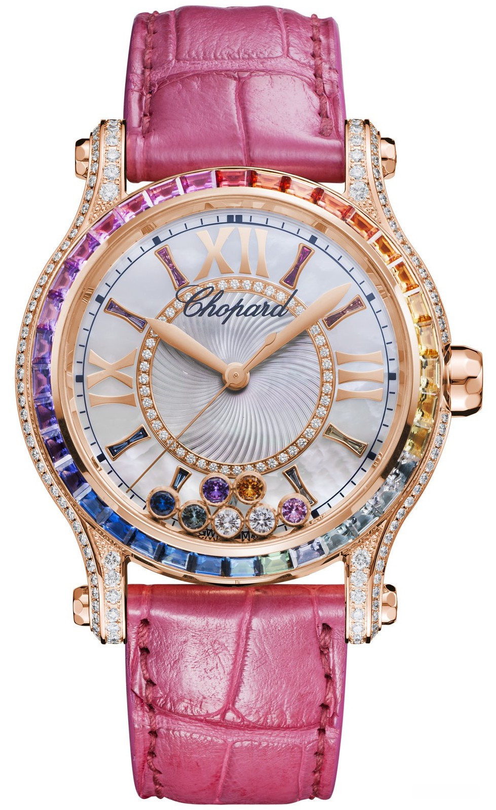 Новая версия из розового золота 18к знаковой модели Happy Sport от Chopard сочетает в себе изысканность, женственность, а также высокую точность, благодаря механическому Калибру с автоподзаводом и 42-часовым запасом хода. Диаметр корпуса составляет 36 мм, водонепроницаемость 30 метров. На белом жемчужном гильошированном циферблате с 7-ю плавающими драгоценными камнями отображаются часы, минуты, секунды. Часы комплектуются ремешком из кожи аллигатора с вставкой из розового золота 18к. Корпус инкрустирован белыми бриллиантами, желтыми, оранжевыми, голубыми и розовыми сапфирами.
