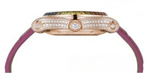 водонепроницаемость 30 м, корпус инкрустирован белыми бриллиантами, желтыми, оранжевыми, голубыми и розовыми сапфирами