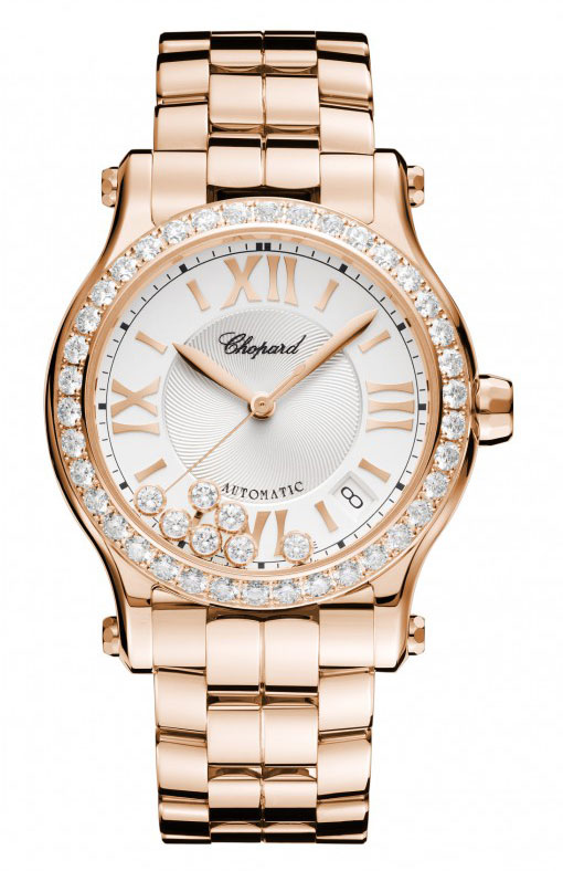 Роскошные женственные часы Happy Sport Automatic из розового золота 750 пробы оснащены механизмом с автоматическим заводом, который обеспечивает 42-часовой запас хода. Модель с миниатюрным корпусом диаметром 36 мм – настоящий гимн радости жизни. Изящный и элегантный матовый серебристый циферблат с гильошированной отделкой и безель с бриллиантовой инкрустацией гармонируют с браслетом из розового золота. Часы Happy Sport – стильный символ свободы и талисман для независимых женщин.
