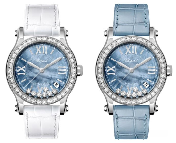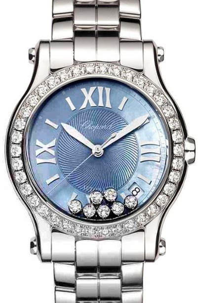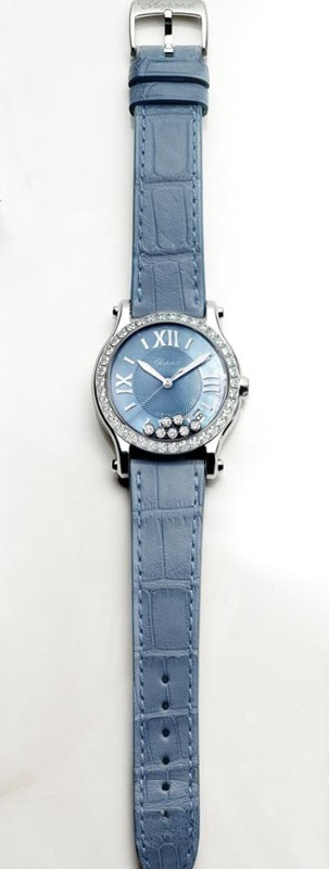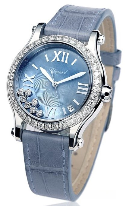 Роскошные женственные часы Happy Sport Automatic из нержавеющей стали оснащены механизмом с автоматическим заводом, который обеспечивает 42-часовой запас хода. Новая модель с миниатюрным корпусом диаметром 36 мм – настоящий гимн радости жизни. Изящный и элегантный голубой жемчужный циферблат с гильошированной отделкой и 7 плавающими бриллиантами гармонируют с безелем из белых бриллиантов. Часы Happy Sport – стильный символ свободы и талисман для независимых женщин.