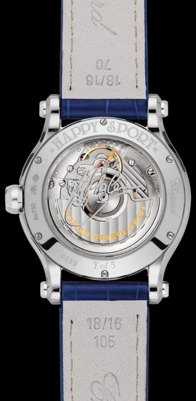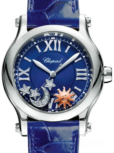Роскошные женственные часы Happy Sport Automatic из нержавеющей стали оснащены механизмом с автоматическим заводом, который обеспечивает 42-часовой запас хода. Новая модель с миниатюрным корпусом диаметром 36 мм – настоящий гимн радости жизни. Изящный и элегантный синий циферблат с гильошированной отделкой и плавающими бриллиантами гармонируют с ремешком из синей кожи аллигатора. Часы Happy Sport – стильный символ свободы и талисман для независимых женщин.