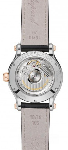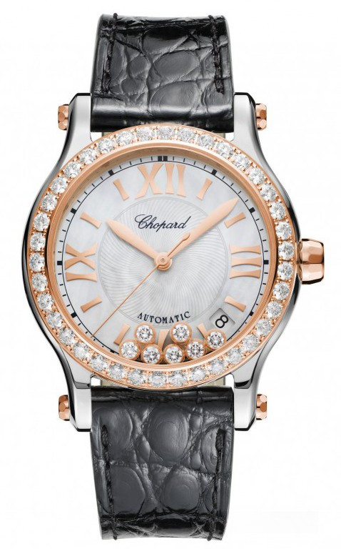 Новая версия из нержавеющей стали и розового золота знаковой модели Happy Sport от Chopard сочетает в себе изысканность, женственность, а также высокую точность, благодаря механическому Калибру с автоподзаводом и 42-часовым запасом хода. Сияние семи "плавающих" бриллиантов на циферблате усиливается черным оттенком ремешка из крокодиловой кожи, который укомплектован пряжкой из нержавеющей стали. Диаметр корпуса составляет 36 мм, водонепроницаемость 30 метров. На белом жемчужном циферблате с 7-ю плавающими бриллиантами отображаются часы, минуты, секунды и дата. Безель из белых бриллиантов.