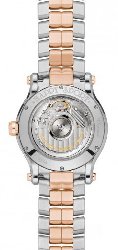Новая версия из нержавеющей стали и розового золота знаковой модели Happy Sport от Chopard сочетает в себе изысканность, женственность, а также высокую точность, благодаря механическому Калибру с автоподзаводом и 42-часовым запасом хода. Диаметр корпуса составляет 36 мм, водонепроницаемость 30 метров. На белом жемчужном циферблате с 7-ю плавающими бриллиантами отображаются часы, минуты, секунды и дата. Безель из белых бриллиантов. Часы комплектуются браслетом из нержавеющей стали и розового золота 18к.