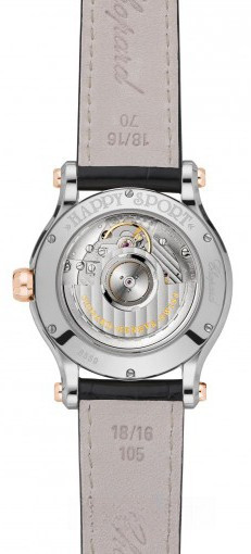 Новая версия из нержавеющей стали и розового золота знаковой модели Happy Sport от Chopard сочетает в себе изысканность, женственность, а также высокую точность, благодаря механическому Калибру с автоподзаводом и 42-часовым запасом хода. Сияние семи "плавающих" бриллиантов на циферблате усиливается черным оттенком ремешка из крокодиловой кожи, который укомплектован пряжкой из нержавеющей стали. Диаметр корпуса составляет 36 мм, водонепроницаемость 30 метров. На белом жемчужном циферблате с 7-ю плавающими бриллиантами отображаются часы, минуты, секунды и дата.
