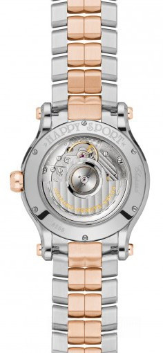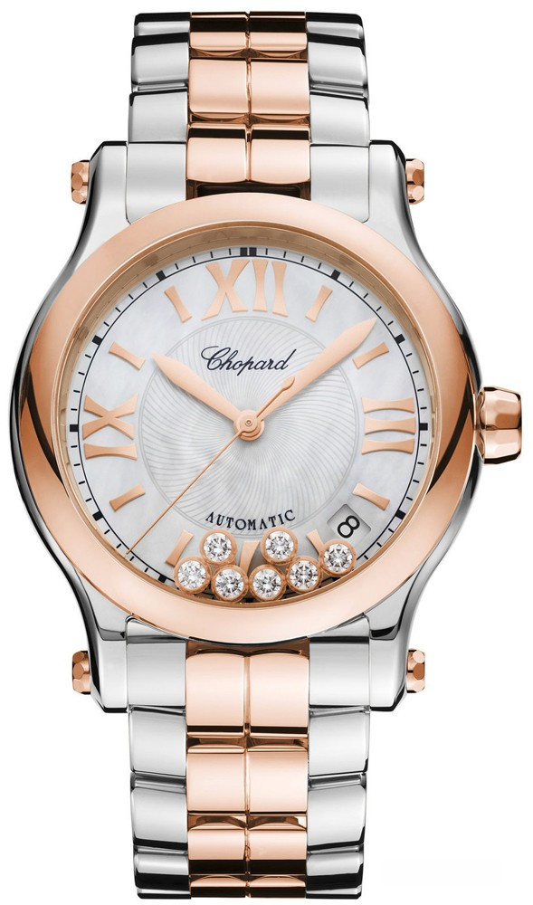 Новая версия из нержавеющей стали и розового золота 18к знаковой модели Happy Sport от Chopard сочетает в себе изысканность, женственность, а также высокую точность, благодаря механическому Калибру с автоподзаводом и 42-часовым запасом хода. Диаметр корпуса составляет 36 мм, водонепроницаемость 30 метров. На серебристом гильошированном циферблате с 7-ю плавающими бриллиантами отображаются часы, минуты, секунды и дата. Часы комплектуются браслетом из нержавеющей стали и розового золота 18к.