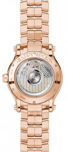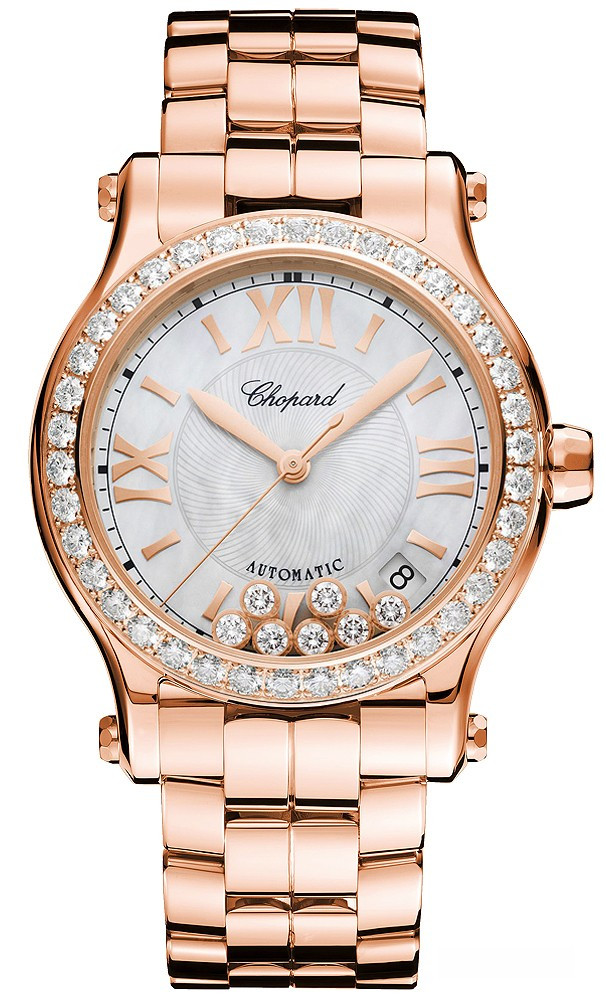 Новая версия из розового золота знаковой модели Happy Sport от Chopard сочетает в себе изысканность, женственность, а также высокую точность, благодаря механическому Калибру с автоподзаводом и 42-часовым запасом хода. Диаметр корпуса составляет 36 мм, водонепроницаемость 30 метров. На белом жемчужном циферблате с 7-ю плавающими бриллиантами отображаются часы, минуты, секунды и дата. Часы комплектуются браслетом из розового золота 18к. Безель из белых бриллиантов.