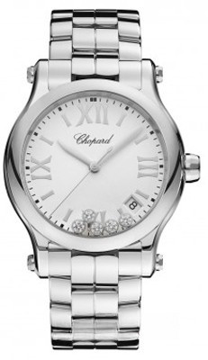 Часы Chopard Happy Sport Medium Quartz выпущены в корпусе из нержавеющей стали, размером 36 мм и водонепроницаемостью 30 м. Внутри корпуса установлен кварцевый механизм. На белом циферблате отображаются часы, минуты, секунды, дата и 5 белых плавающих бриллиантов. Часы комплектуются браслетом из нержавеющей стали.
