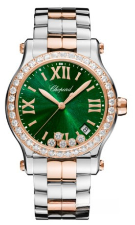 Часы Chopard Happy Sport 36 mm Quartz выпущены в корпусе из нержавеющей стали и розового золота 18к размером 36 мм и водонепроницаемостью 30 м. Внутри корпуса установлен кварцевый механизм. На зеленом циферблате с 5-ю плавающими белыми бриллиантами отображаются часы, минуты, секунды, дата. Часы комплектуются браслетом из нержавеющей стали и розового золота 18к. Безель из белых бриллиантов.