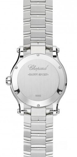 Часы Chopard Happy Sport Medium Quartz выпущены в корпусе из нержавеющей стали размером 36 мм и водонепроницаемостью 30 м. Внутри корпуса установлен кварцевый механизм. На белом циферблате отображаются часы, минуты, секунды, дата. Часы комплектуются браслетом из нержавеющей стали. Безель из белых бриллиантов.