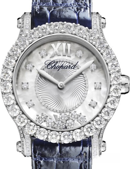 Корпус, размером 36 мм, из белого золота 18к и перламутровый циферблат, инкрустирован белыми бриллиантами общим весов в 7.74 карата. Самые крупные на безеле и традиционные плавающие 7 бриллиантов помимо бриллиантовых меток на белом перламутре. Задняя крышка открыта с видом на мануфактурный механизм L.U.C 96.17-C с автоподзаводом и микро ротором из 22 каратного золота, который обеспечивает запас хода до 65 часов. Дополняет образ ремешок из кожи аллигатора темно-синего цвета с классической пряжкой инкрустированной бриллиантами, дополнительная регулировка ремешка.