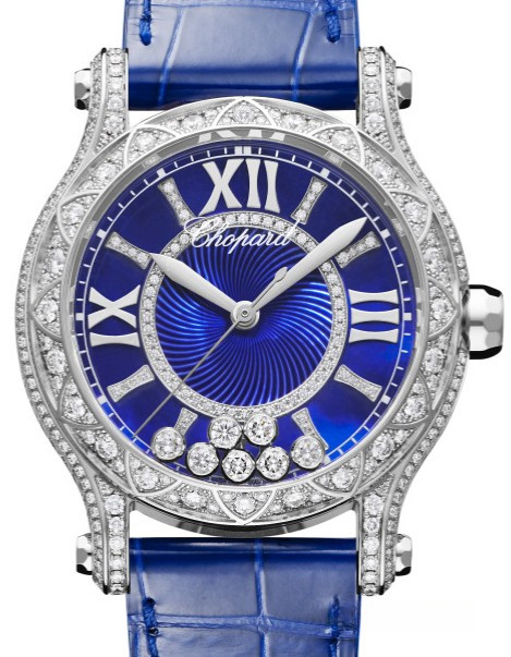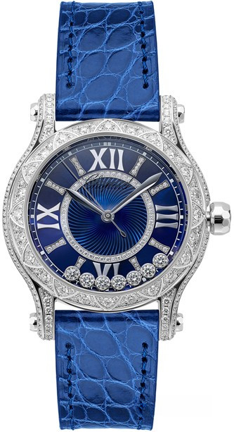 Начиная с 1993 года в коллекции Happy Sport жизнерадостно смешиваются жанры и стили, сталь и бриллианты, вечное и эфемерное. Оригинальное и авангардное видение. Изысканный и в то же время спортивный стиль. Вызывающий чувство радости, независимый, озорной и абсолютно современный аксессуар примеряет различные образы, сохраняя исключительную женственность. Little Diamonds Do Great Things. Часы из белого золота 18к диаметром 36 мм инкрустированы белыми бриллиантами. Внутри находится автоматический механизм с индикацией часов, минут и секунд на синем гильошированном циферблате с белыми бриллиантами. Серия ограничена - 25 шт.
