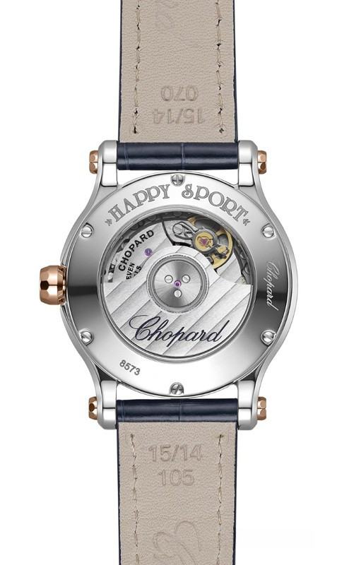 Часы Chopard Happy Sport Sun, Moon & Stars представлены в корпусе из нержавеющей стали и розового золота 18к размером 30 х 11.13 мм водонепроницаемостью 30 метров. Внутри корпуса установлен автоматический механизм, Калибр Chopard 09.01-C, обладающий запасом хода 42 часа. На синем циферблате отображаются часы, минуты, секунды. Часы поставляются на ремешке из кожи аллигатора с вставкой из нержавеющей стали.