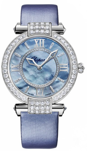 Часы IMPERIALE с автоматическим заводом являются воплощением женственной элегантности. Полированное белое золото 750 пробы подчеркивает сияние усыпанных бриллиантами корпуса и браслета на фоне синего перламутрового циферблата. Украшенные бриллиантами ушки корпуса, ободок и часовые метки этой изысканной модели выполнены в фирменном стиле Chopard.