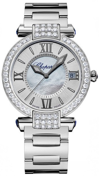 Эффектное сочетание благородных материалов подчеркивает искусное чередование изогнутых и прямых линий этой модели IMPERIALE с автоматическим заводом. Часовой корпус и браслет из белого золота 750 пробы, изящная перламутровая вставка на серебристом циферблате и бриллианты на ободке делают эти часы по-настоящему величественными. Ушки корпуса и заводная головка изысканно украшены аметистами, цвет которых напоминает пурпурное облачение византийских императоров.