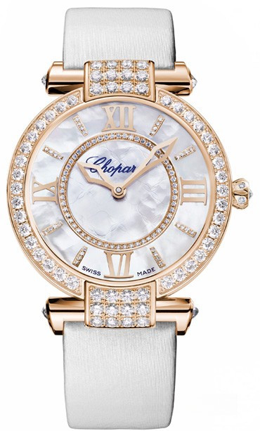 Часы IMPERIALE с автоматическим заводом являются воплощением женственной элегантности. Полированное розовое золото 750 пробы подчеркивает сияние усыпанного бриллиантами корпуса и белого перламутрового циферблата. Украшенные бриллиантами ушки корпуса, ободок и часовые метки этой изысканной модели выполнены в фирменном стиле Chopard.