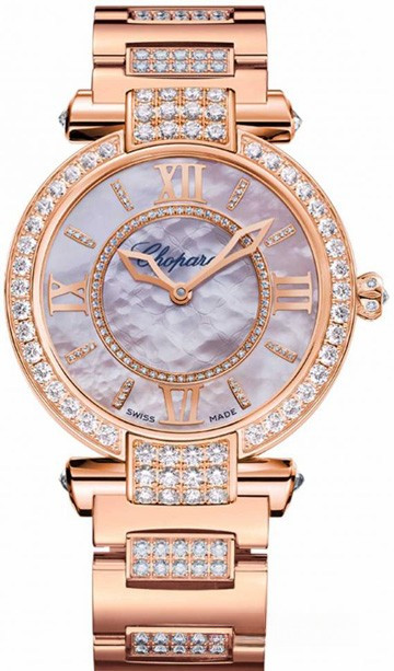 Часы IMPERIALE с автоматическим заводом являются воплощением женственной элегантности. Полированное розовое золото 750 пробы подчеркивает сияние усыпанного бриллиантами корпуса и розового перламутрового циферблата. Украшенные бриллиантами ушки корпуса, ободок и часовые метки этой изысканной модели выполнены в фирменном стиле Chopard.