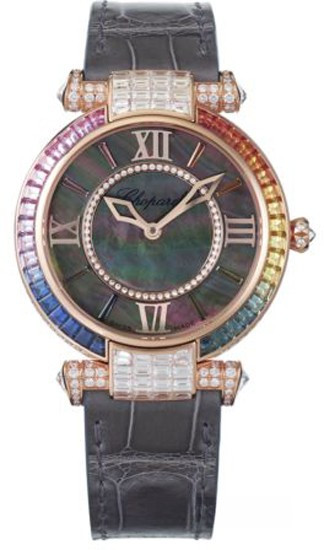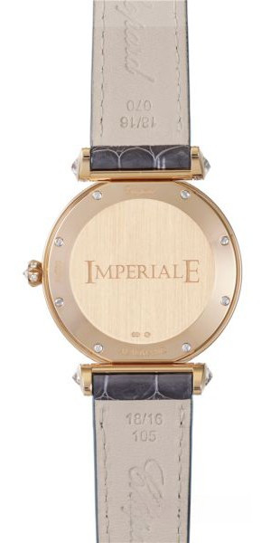 Выполненная из розового золота 18к модель Imperiale с инкрустированным бриллиантами и сапфирами корпусом и автоматическим заводом является эталоном утонченного дизайна. В центре современного черного жемчужного циферблата с белыми бриллиантами находятся часовая и минутная стрелки. Элегантные стрелки и величественные римские цифры ведут отсчет времени, а изысканный кабошон на заводной коронке придает модели удивительную утонченность. Часы поставляются на ремешке из кожи аллигатора с вставкой из розового золота 18к.
