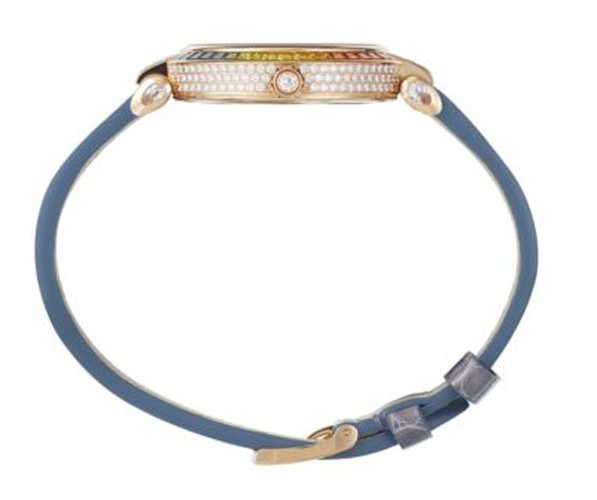 водонепроницаемость 50 м, корпус инкрустирован белыми бриллиантами и разноцветными сапфирами