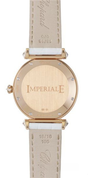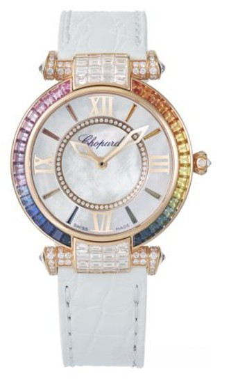 Выполненная из розового золота 18к модель Imperiale с инкрустированным бриллиантами и сапфирами корпусом и автоматическим заводом является эталоном утонченного дизайна. В центре современного белого жемчужного циферблата с белыми бриллиантами находятся часовая и минутная стрелки. Элегантные стрелки и величественные римские цифры ведут отсчет времени, а изысканный кабошон на заводной коронке придает модели удивительную утонченность. Часы поставляются на ремешке из кожи аллигатора с вставкой из розового золота 18к.