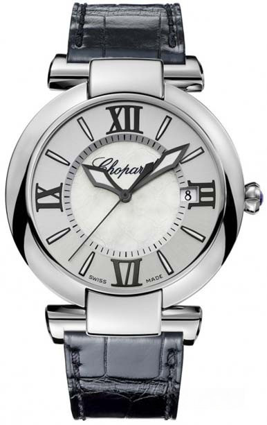 Выполненная из нержавеющей стали модель IMPERIALE с автоматическим заводом является эталоном утонченного дизайна. Изысканно изогнутые стрелки в стиле ампир ведут отсчет времени на серебристом циферблате с перламутровым элементом в центре и величественными римскими цифрами. Благородный блеск украсившего заводную коронку аметиста в форме кабошона напоминает пурпурное убранство византийского императорского двора.
