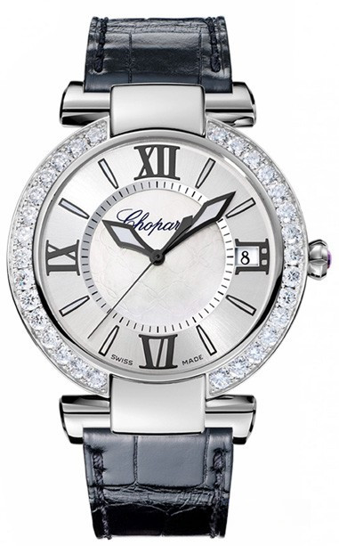 Лаконичность скульптурного дизайна часов IMPERIALE из нержавеющей стали с автоматическим заводом эффектно дополняет драгоценный блеск бриллиантов на ободке. Изысканно изогнутые стрелки в стиле ампир ведут отсчет времени на серебристом циферблате с перламутровым элементом в центре и величественными римскими цифрами. Благородный блеск украсившего заводную коронку аметиста в форме кабошона напоминает пурпурное убранство византийского императорского двора.