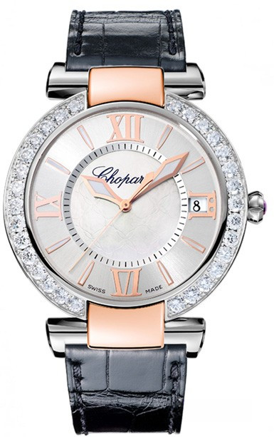 Лаконичность скульптурного дизайна этих часов IMPERIALE из розового золота 750 пробы и нержавеющей стали с автоматическим заводом эффектно дополняет драгоценный блеск бриллиантов на ободке. Изысканно изогнутые стрелки в стиле ампир ведут отсчет времени на серебристом циферблате с величественными римскими цифрами. Благородный блеск украсившего заводную коронку аметиста в форме кабошона напоминает пурпурное убранство византийского императорского двора.