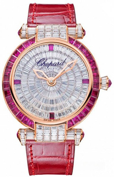 Блистательный эталон элегантности и неповторимого стиля – часы IMPERIALE из розового золота 750 пробы украшены бриллиантами и рубинами багетной огранки в невидимой закрепке. Все детали этих часов с автоматическим заводом – полностью украшенные бриллиантами циферблат и ободок, ушки с бриллиантами, – выразительно подчеркивают многогранность женской натуры.