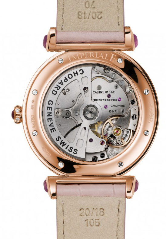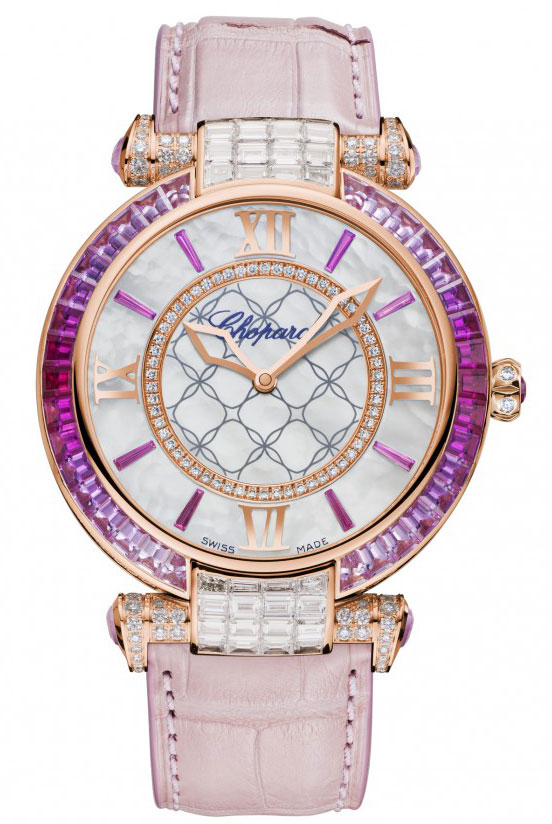 водонепроницаемость 50 м, корпус инкрустирован белыми бриллиантами круглой и багетной огранки, безель из багетных сапфиров