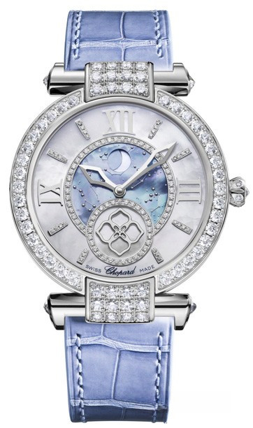 Часы IMPERIALE Moonphase – высшее воплощение романтизма и женской элегантности. Луна и звезды на искусно выполненном циферблате приглашают в поэтическое путешествие, сопровождаемое мерцающими нюансами белого и голубого перламутра в блеске бриллиантов. Великолепные как внутри – благодаря механизму Chopard 96.25-C – так и снаружи, часы Imperiale Moonphase воспевают грациозную женственность.