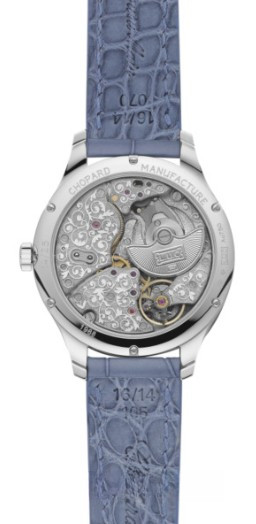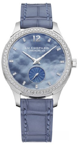Часы Chopard L.U.C XP Esprit de Fleurier Peony представлены в корпусе из белого золота 18к размером 35 х 7.7 мм водонепроницаемостью 30 метров. Внутри корпуса установлен автоматический механизм, Калибр L.U.C 96.23-L1, обладающий запасом хода 65 часов. На голубом жемчужном циферблате с белыми бриллиантами отображаются часы, минуты и секунды. Часы комплектуются ремешком из кожи аллигатора с вставкой из белого золота 18к. Безель из белых бриллиантов.